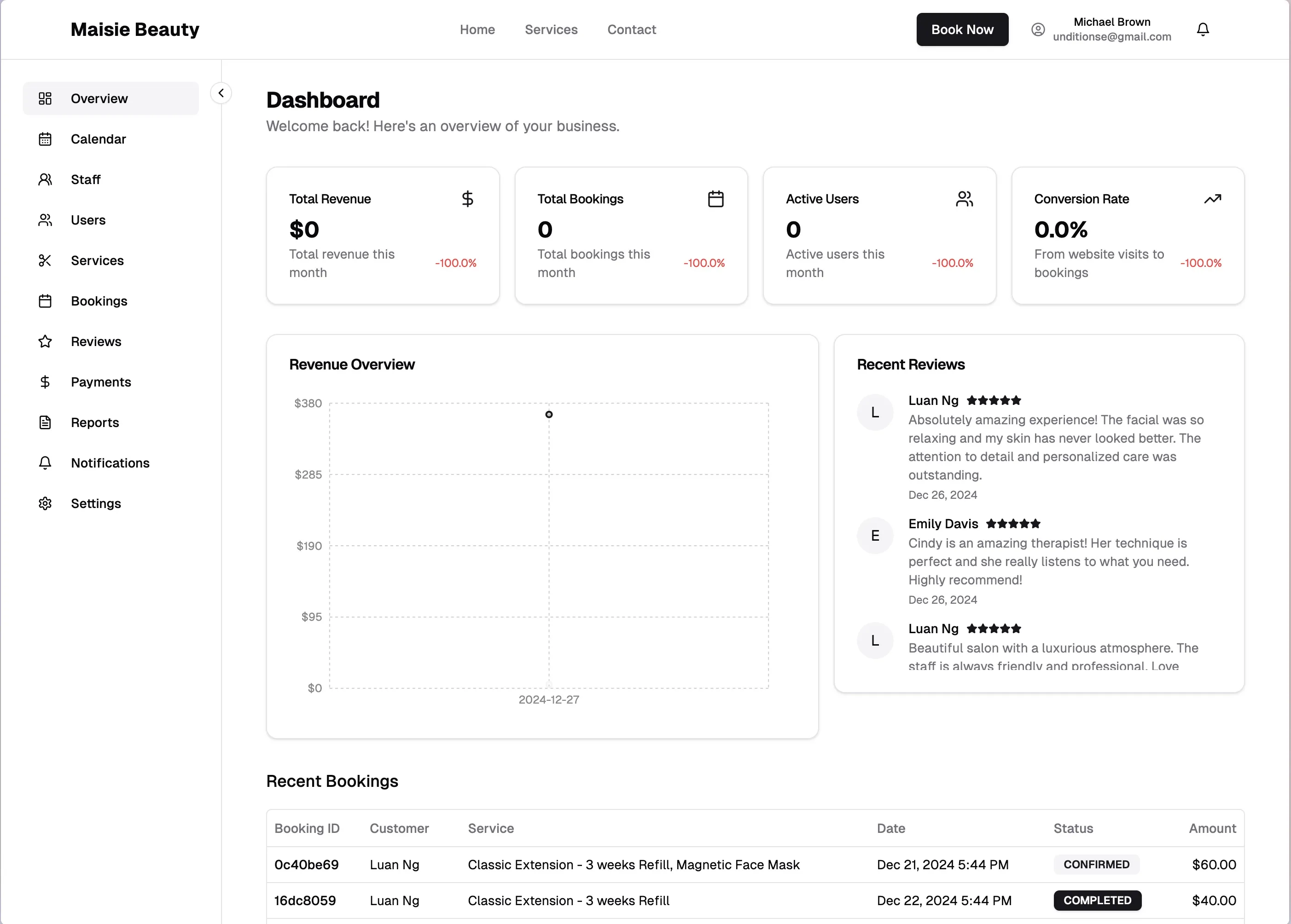 Modern Salon Booking & Management Platform. Maisie Beauty is a full-stack web application, offering seamless booking experiences for customers and powerful management tools for administrators. The platform serves both customers and salon administrators with a sleek, user-friendly interface